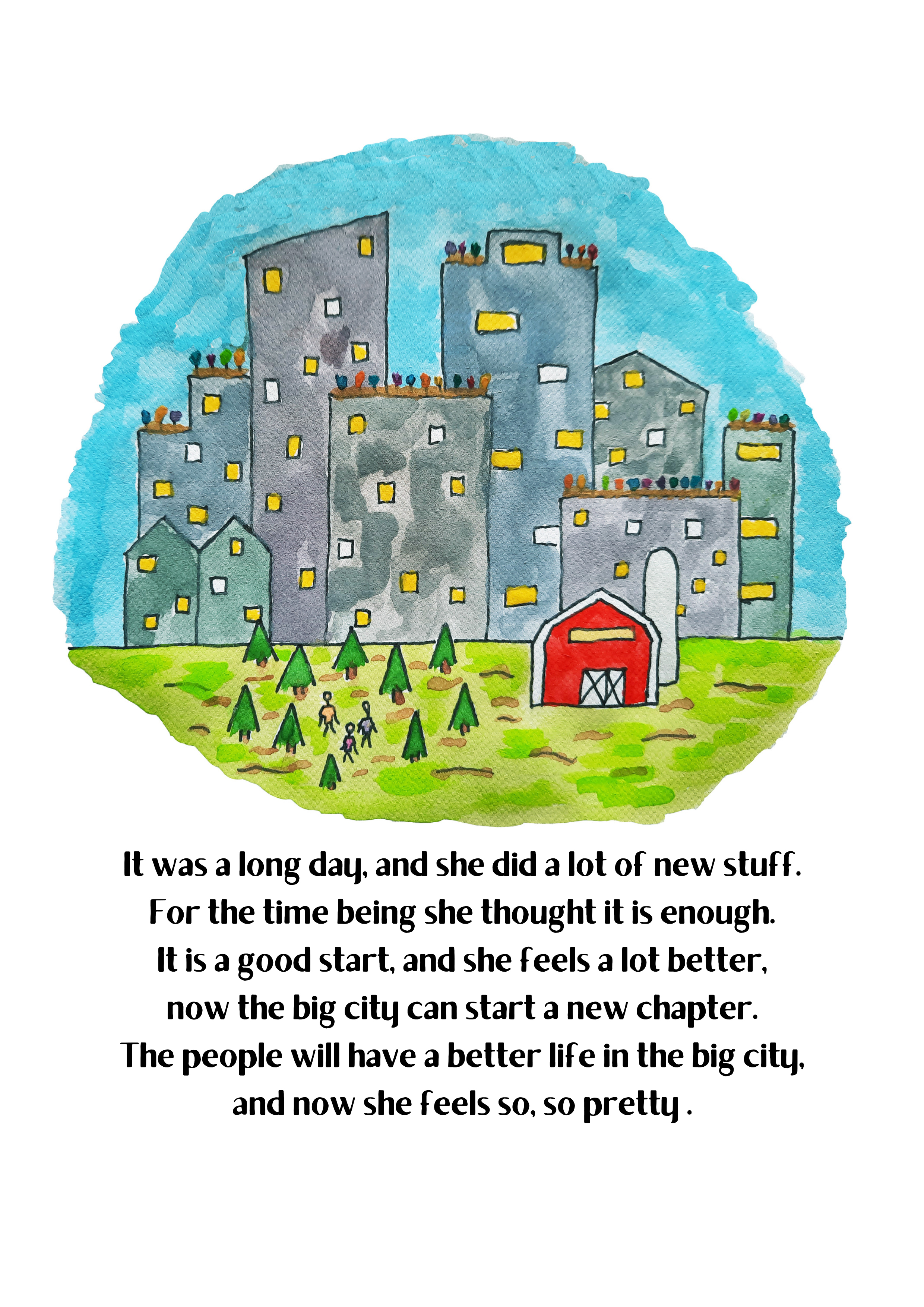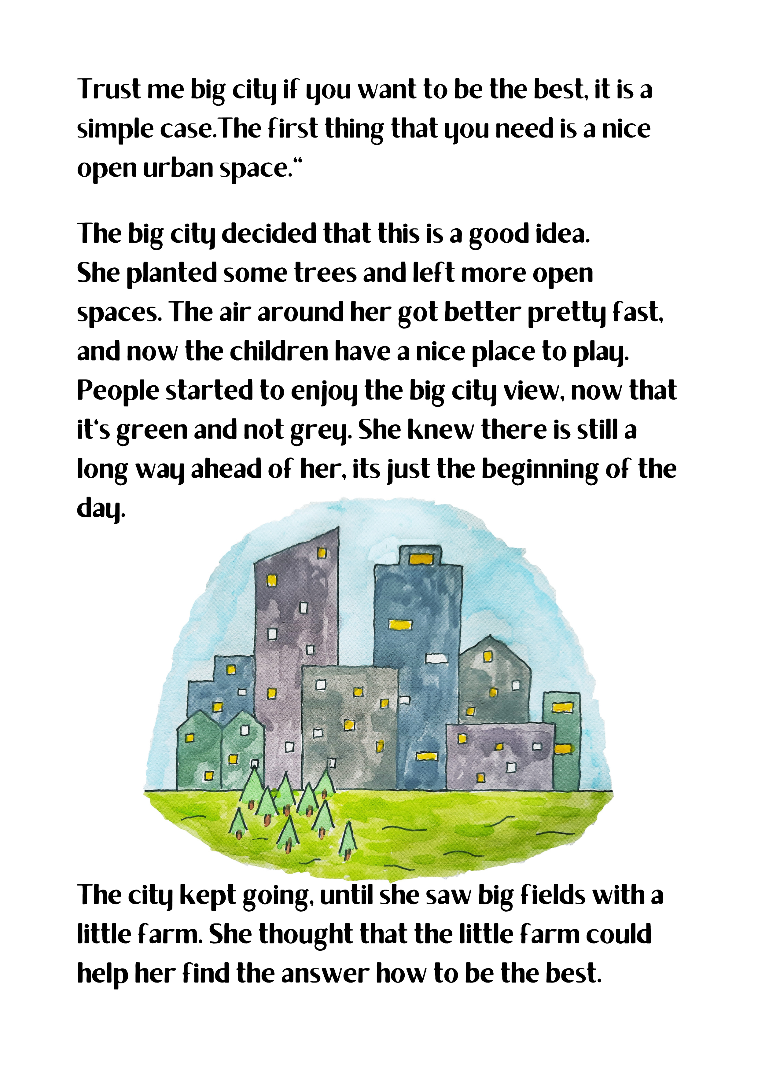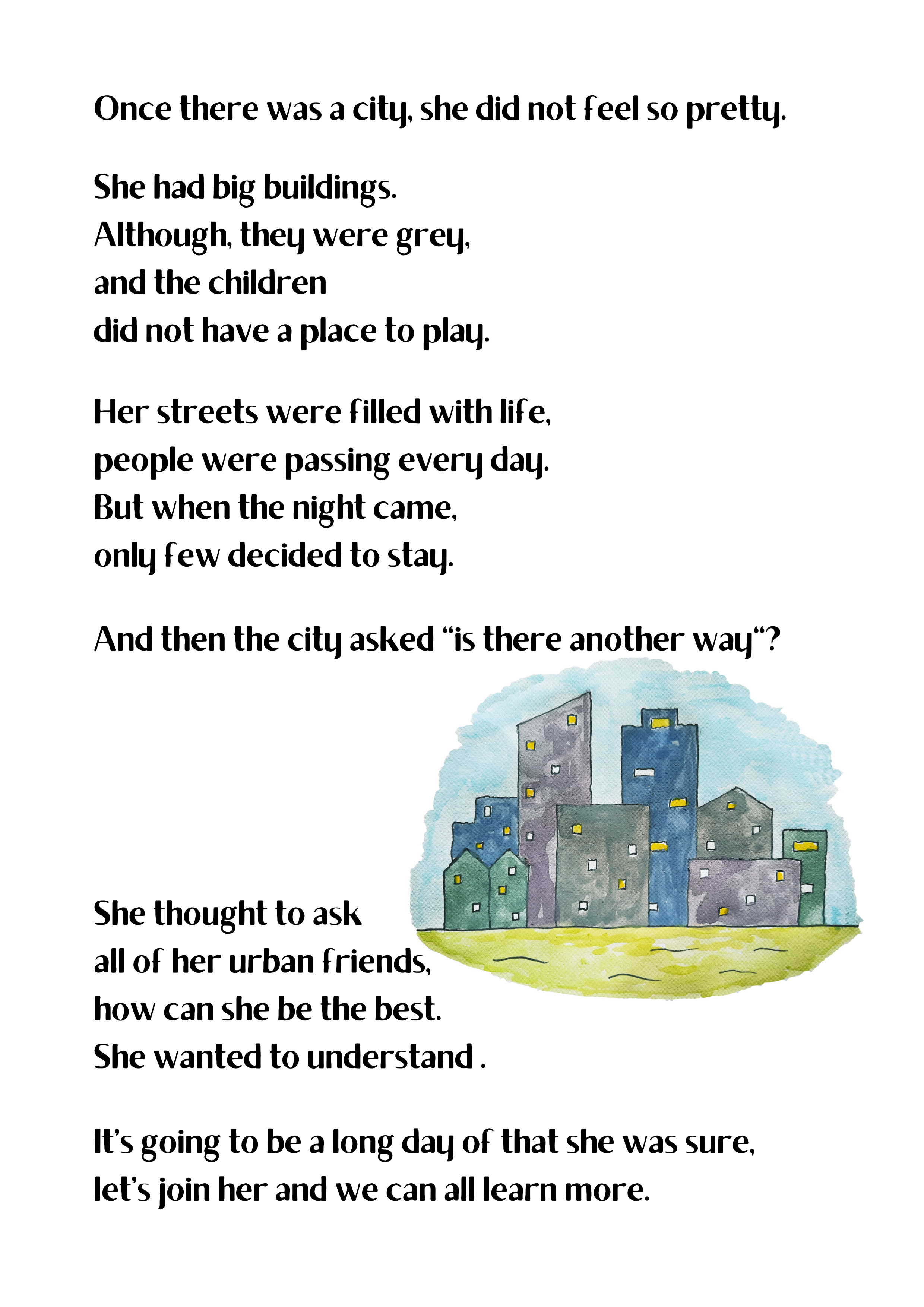 The City That Wanted to Feel Pretty is a short children's story about the struggles of one city and it's encounters with other beings around it. It's goal is to expose people at a young age to the urgency of sustainable cities.